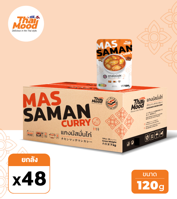 แกงมัสมั่นไก่พร้อมทาน อาหารพร้อมรับประทาน จากวัตถุดิบคุณภาพเข้าถึงความเป็นไทยในรสชาติต้นตำรับแท้ๆ เก็บในอุณหภูมิปกติได้นาน 1ปี ไม่ต้องแช่เย็นพกพาสะดวก ง่ายแค่ฉีกซอง